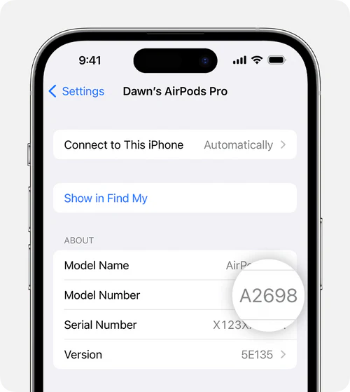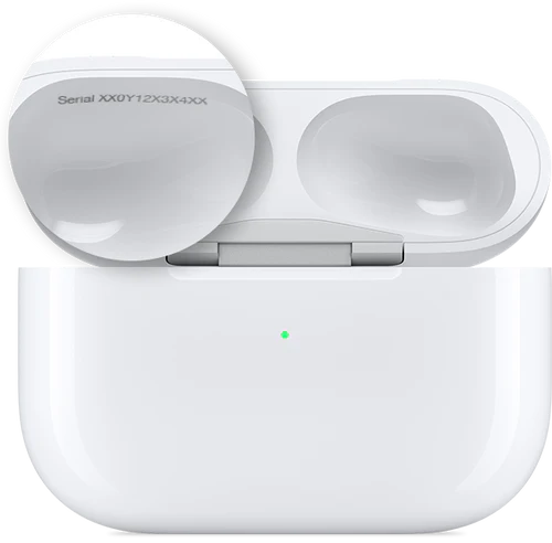 Kijk naar de eerste regel van de tekst op de onderkant van elke AirPod. Hier vind je het modelnummer.